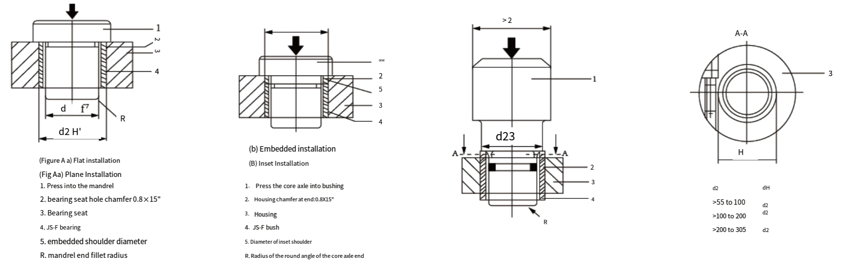 HZ-Buchsen sollten in einer Hand mit Kerosin oder Dieselöl gereinigt, in Motoröl getaucht und dann getrocknet werden. Stellen Sie beim Einbau der Buchse in das Gehäuse sicher, dass sich die Buchse nicht im Gehäuse dreht oder sich in axialer Richtung bewegt, und stellen Sie gleichzeitig sicher, dass die Außenfläche vollständig Kontakt mit der Grundbohrung hat. Stellen Sie im Allgemeinen sicher, dass die Kontaktfläche mehr als 70 % beträgt, um so die Belastbarkeit und die Übertragung von Reibungswärme zu verbessern. Die Innenfläche der HZ-Buchse besteht aus selbstschmierendem Kunststoff, die Außenfläche aus Stahl. Der Reibungskoeffizient von Stahl zu Stahl ist größer als der von Stahl zu Kunststoff. Daher sollten wir die leicht abgestufte feste Passung wählen, um zu verhindern, dass sich die Achshülse beim Arbeiten in der Basis bewegt, und auch verhindern, dass die inneren Löcher aufgrund der großen festen Passung des Außendurchmessers verformt und zu groß werden.